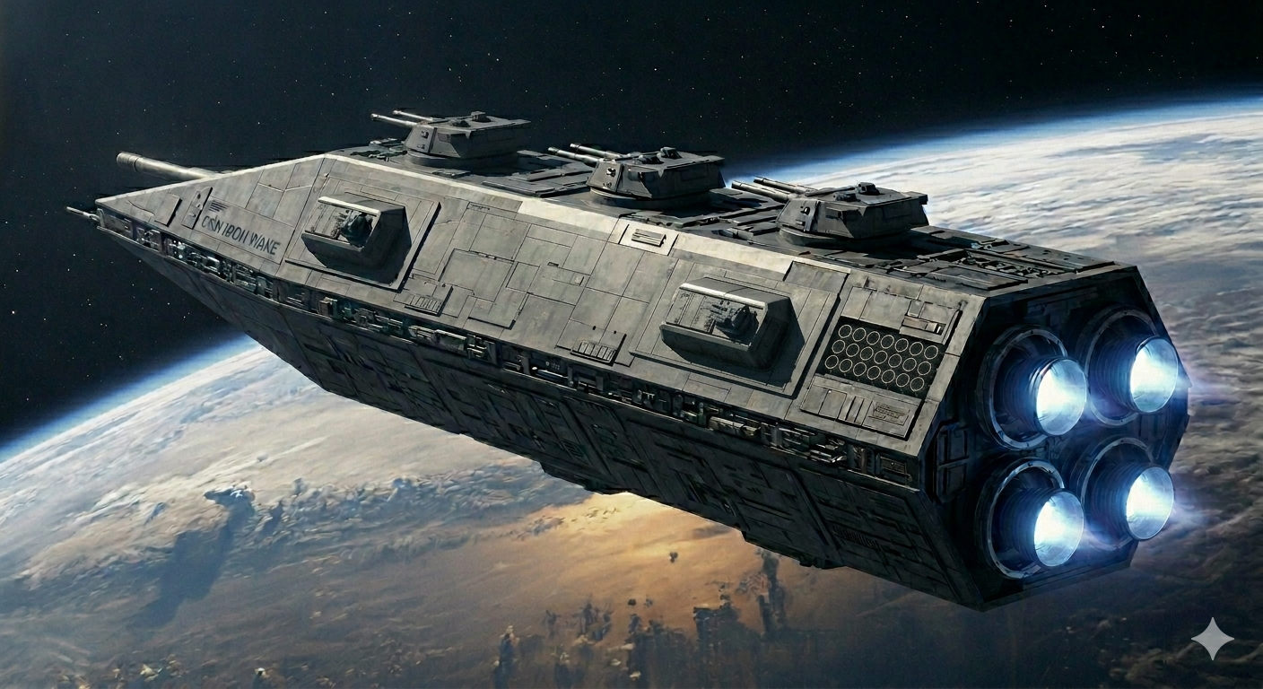 CSN Iron Wake: A 450m heavy capital warship. Target is 50,000–80,000 triangles for the LOD0 hero mesh.