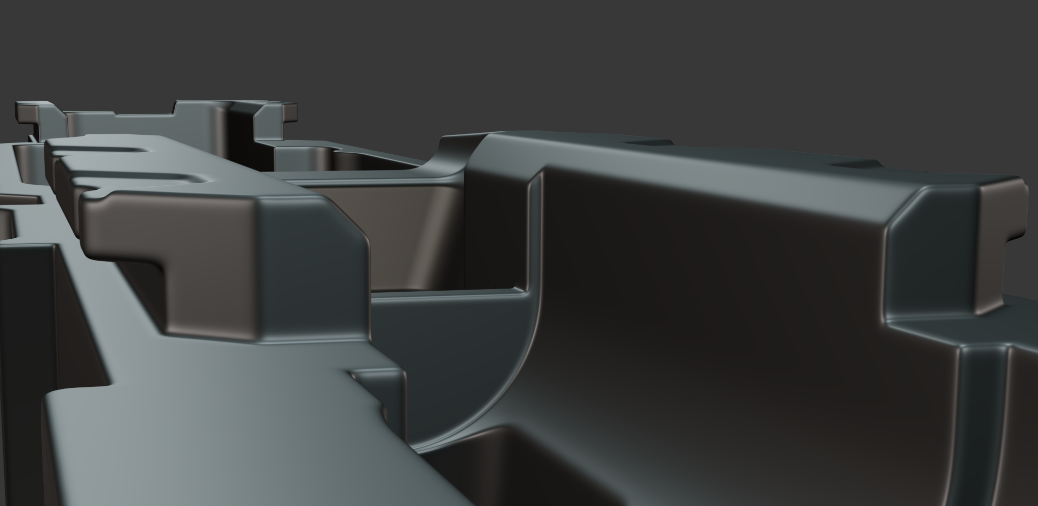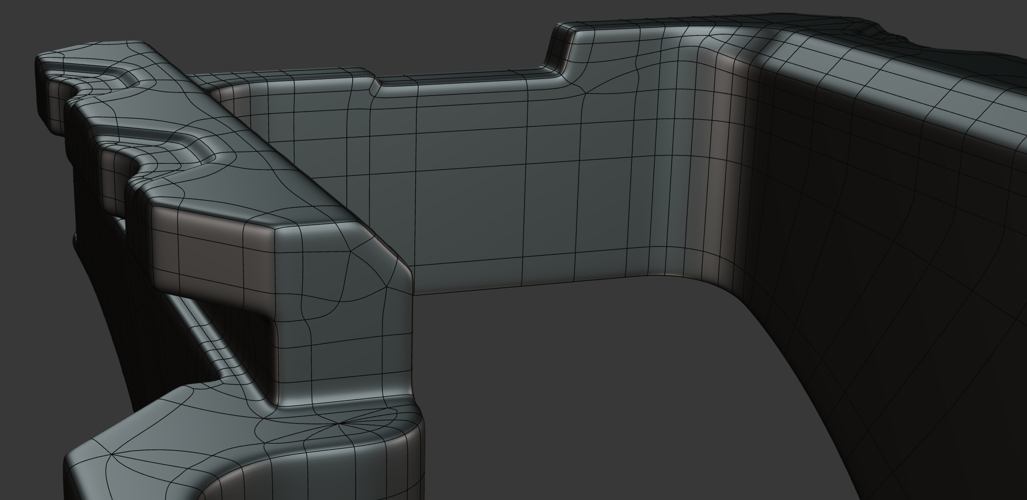 The rear rails you can see I went with a slightly different flow, simply because there's a 45° edge on the front face, which taunts me to secure it first and foremost. The slight width-inconsistency you can see on the smoothed curve/edge is not due to my geometry, but due to catmull-clarke generating a wider and softer curve as the angle of the faces decrease.