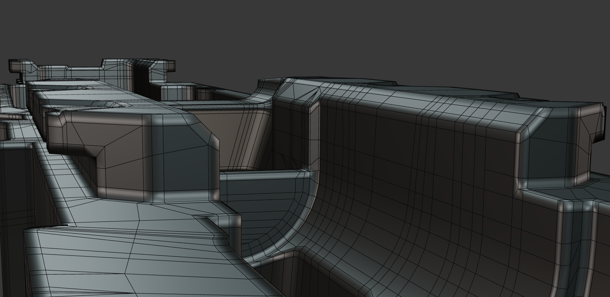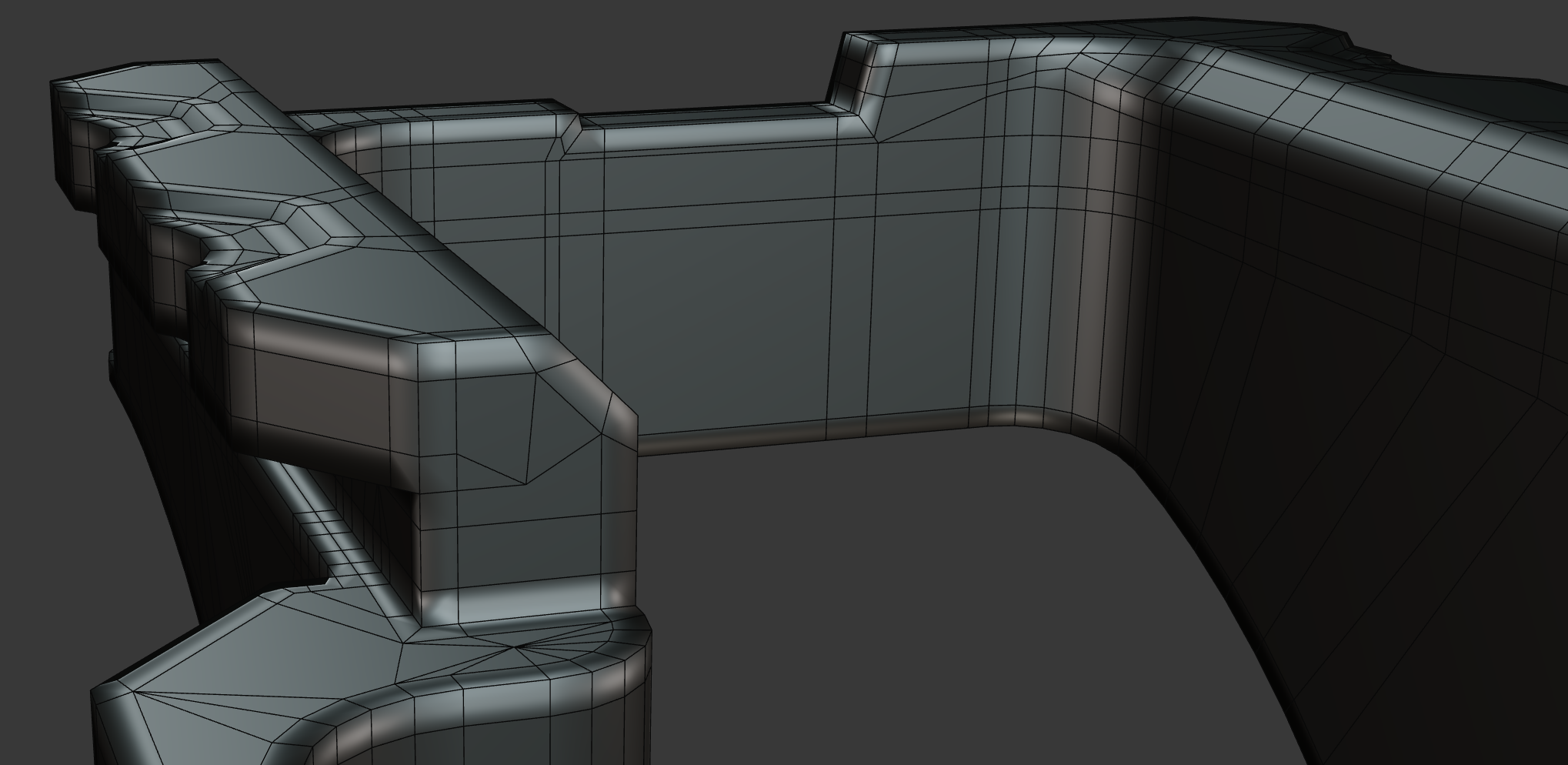 Below is what the final model looks like. All of the smaller support loops, along the edges that define the shapes, are automatically generated using a bevel / chamfer modifier that's controlled by edge weights.