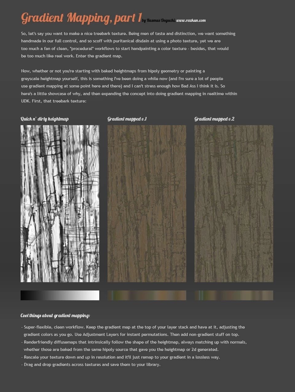 Part 1 is about how you use this as a sort of procedural basis for your diffuse textures, having them generated based upon a heightmap ? Purely a photoshop thing ? Mind showing how you do this exactly, it isn't really mentioned and I haven't used this before.