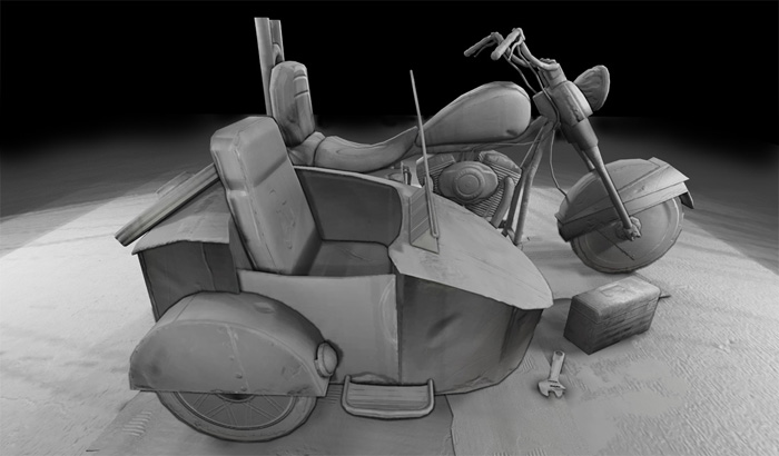 The cardboard, toolbox, and wrench were thrown in last to help fill out the scene, and also to help with a little narration. I'm pretty proud of the lighting setup as well. It gives me some liberty to not worry about the background so much so that I can focus on showing off the bike. I didn't want to have a blank background for it to sit on, but I also didn't want to overcrowd the scene either.