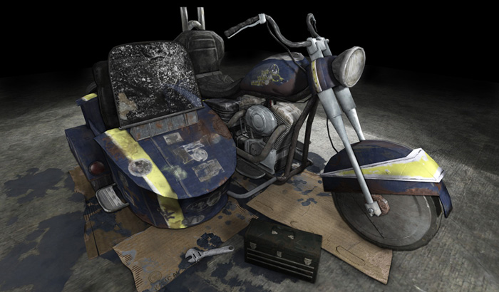 The cardboard, toolbox, and wrench were thrown in last to help fill out the scene, and also to help with a little narration. I'm pretty proud of the lighting setup as well. It gives me some liberty to not worry about the background so much so that I can focus on showing off the bike. I didn't want to have a blank background for it to sit on, but I also didn't want to overcrowd the scene either.