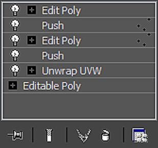 Apply all those modifiers in the stack to your newly created poly shape, exactly as you see them in the image. The ‘Unwrap UVW’ will be used on every single layer to move the UV shells up, down, right or left by exactly 0.5 in U & V space to be able to cover all four sections of our texture. The first push modifier affects the entire shape, this creates the final distances between all the polygon layers.