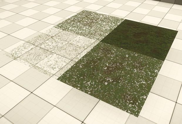 Can you explain why you chose to go for this method, instead of a blend texture in the shader? That would be much faster to paint in on individual rocks etc, and also seems cheaper. Isnt this taking a lot of ressources in overdraw compared to the gain in quality compared to having used a blend texture?