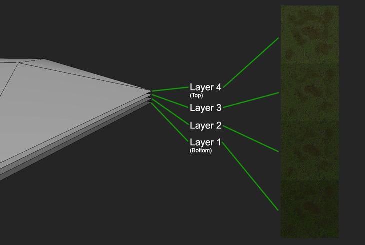 "Once the four layers are created, with all of them sequentially having their border vertex pushed back, they will create a nice fuzzy transition to the rock."
