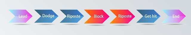 There are 6 ways to accomplish Attack and Defense Transition: Intercept, Dodge- Riposte, Block- Riposte, Borrow force- Riposte, Get hit- Riposte, Parry- Riposte.