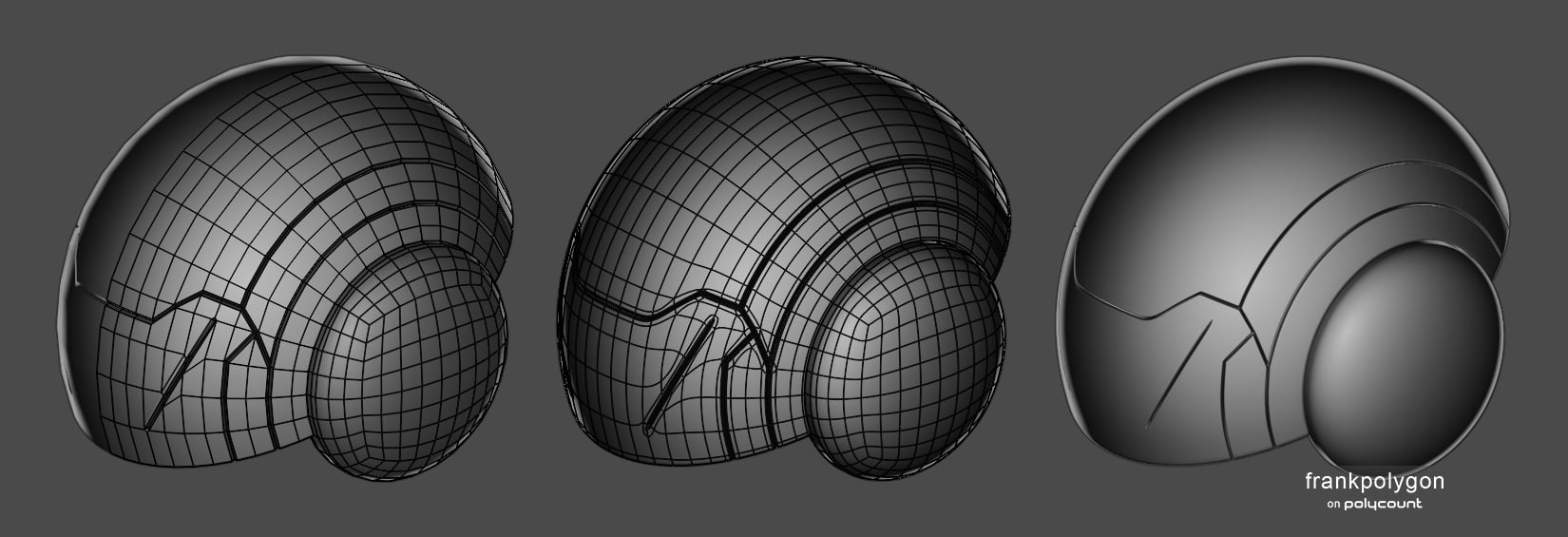 Here's what the final high poly looks like. The editable base mesh is fairly simple, all of the support loops are added around the panel lines with a bevel / chamfer modifier and the entire surface of the helmet follows the underlying guide shape using a shrinkwrap modifier. This keeps everything in the final high poly nice and crisp but still easy to work with.