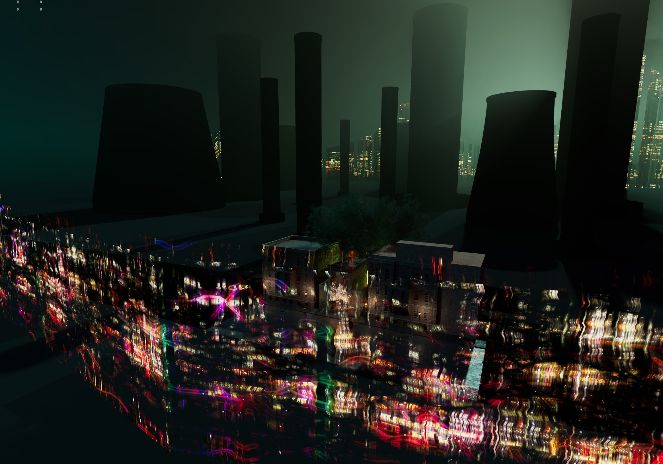 + Created a map for glass and metal reflections. Since the building is facing total black void, the glass was not reflecting anything previously. The metal was a bit too dark as well. This map in front of the building doesn't need to be visible in the render, only in the reflections (leaving it on for demonstration purpose).