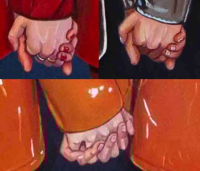But here, the simple fact that she lies by ommission during the interview by clearly misrepresenting her work (roleplaying as someone conjuring detail and colors onto canvas without reference) is personally all I need to see in order to be 99.99% convinced that it is all a grift relying on Midjourney tracing and color matching. And to be honest I don't really give her the remaining 0.01% of benefit of the doubt, since even if it was (uncredited = illegal) photo tracing then the stolen source for these images of twins holding hands would be known.