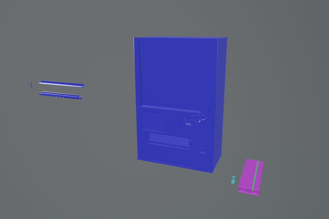 Attached file 'VendingMachine_low' contains just lowpoly with zipped textures (normal, ao). Surely it's not perfect, but hopefully enough to illustrate some points. I hope it's okay to attach files of that size, I can remove them after some time.
