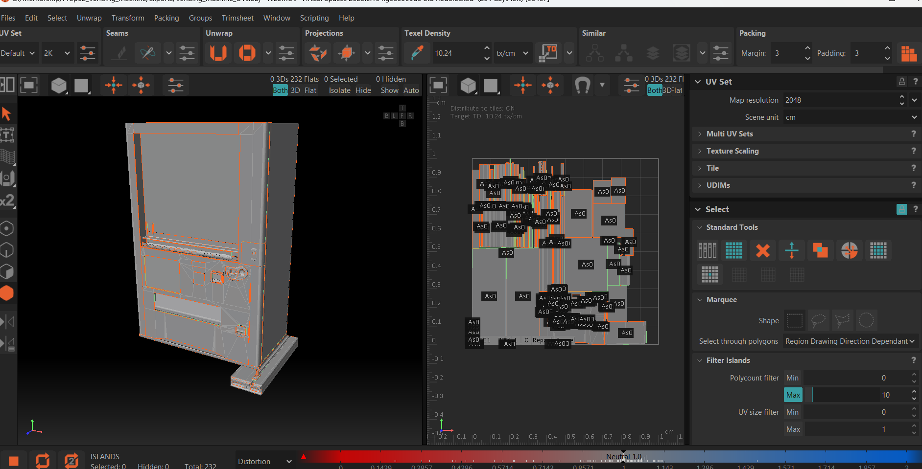 • Keep in mind that if you simply pack for consistent texel density, it will give areas which are not visible (backside, top, bottom, interiors) same amount of resolution than areas that are visible. That's resolution that could go towards prominent or complex areas. On such an asset, I would manually control UV size based on visibility and complexity. I do the same for lightmap UVs, give low priority areas less space, increase space used by high priority areas. For assets using tiling textures or can bee seen from all angles consistent texel density makes sense.