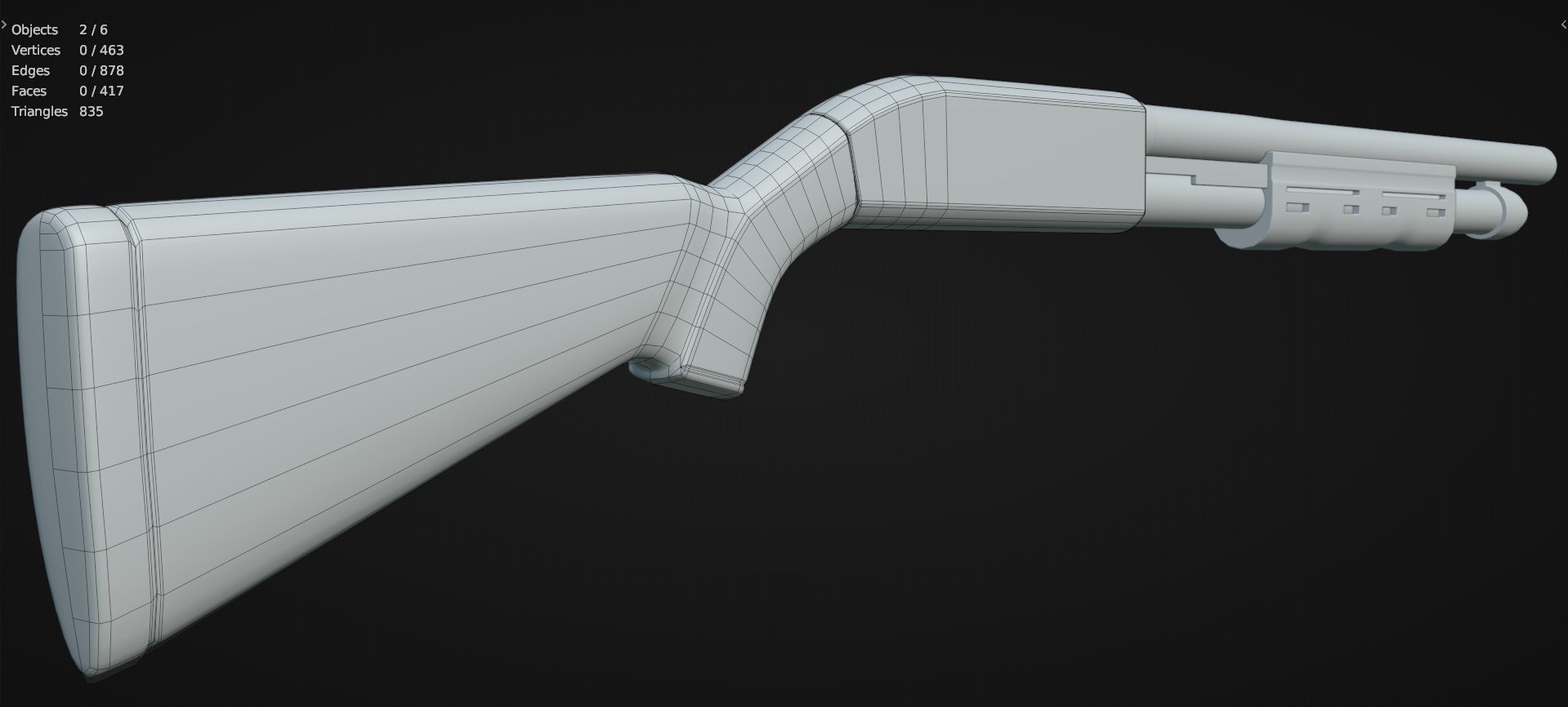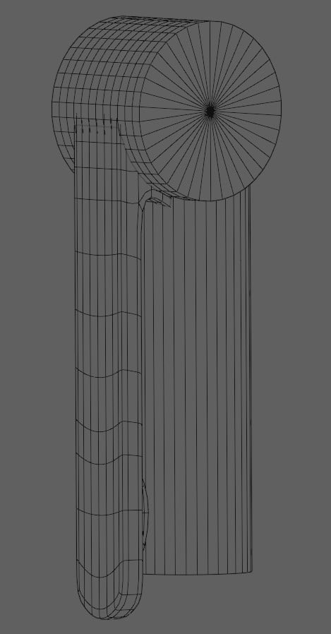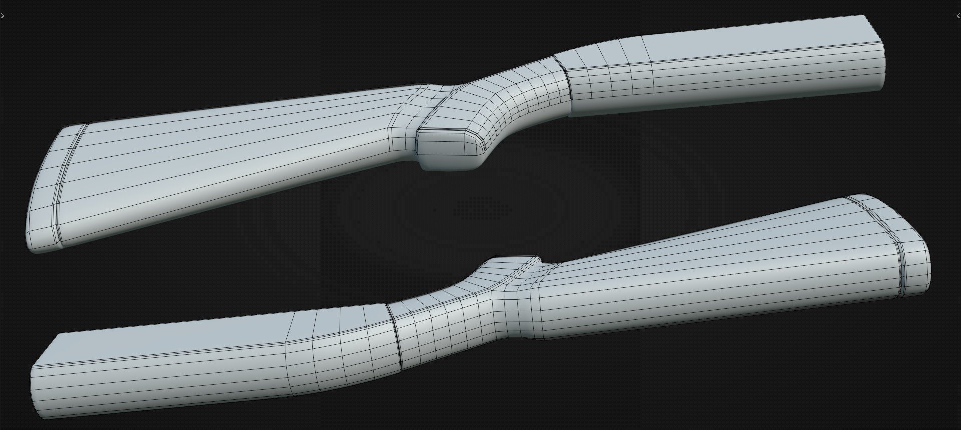 Below is an example of what a basic shape and strip based modeling approach could look like. Start by blocking out the proportions of the largest forms first. In this case the the curvature of the grip and the profile of the butt. Work from largest to smallest. Keeping everything relatively simple and fairly uniform, while roughly matching the segments so they line up across the adjacent shapes.